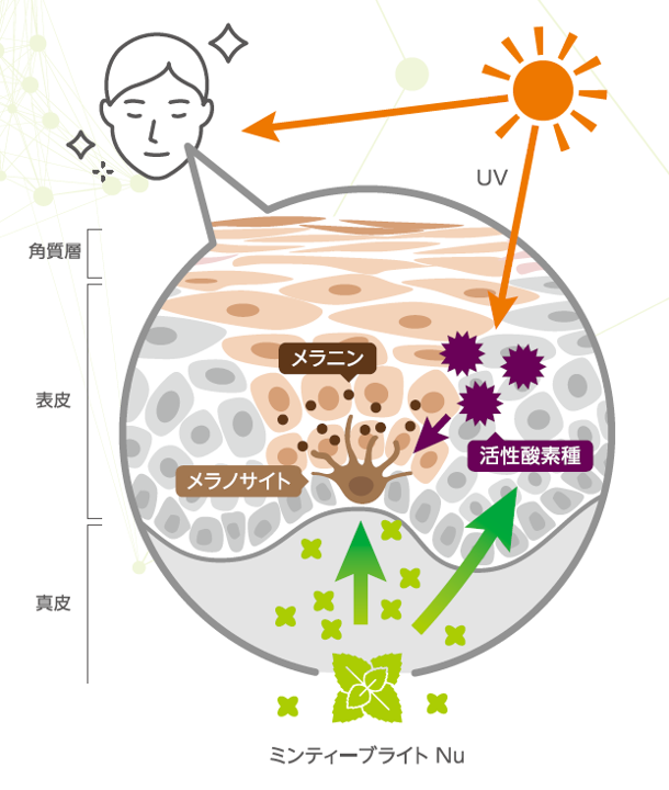酸化ストレスとメラニン産生を調節することで、ミンティーブライトNuは美白効果をもたらします。